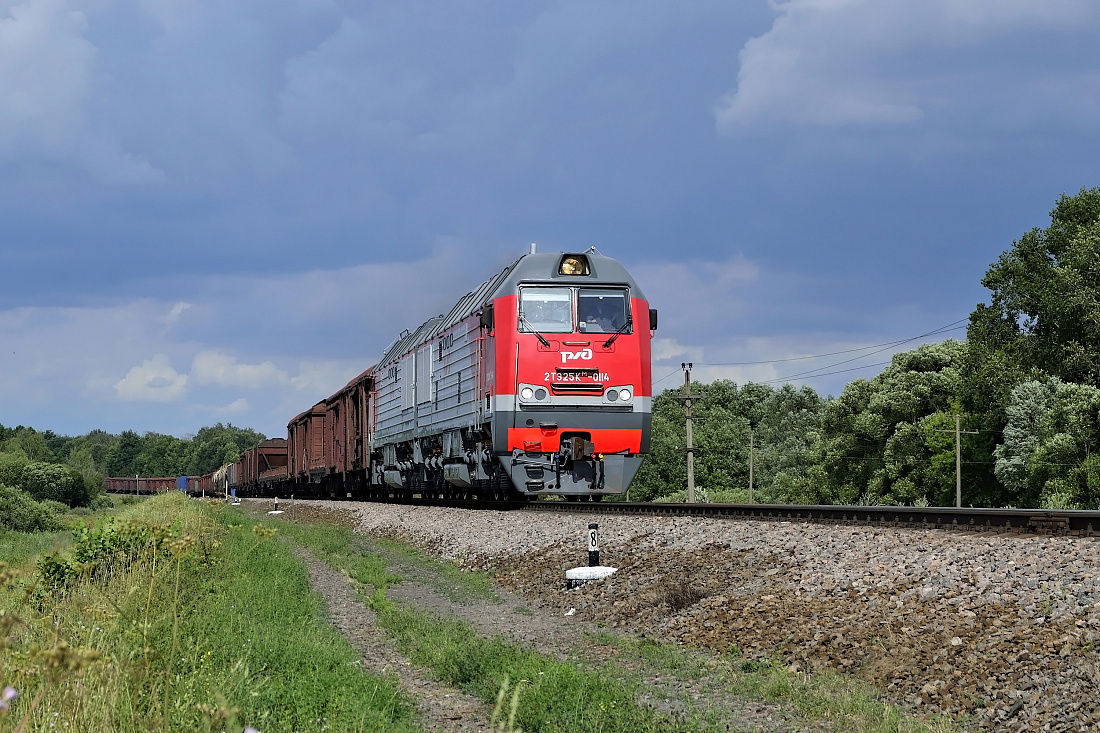 Тепловоз 2ТЭ25КМ-0114 с грузовым поездом на перегоне Манюки - Новозыбков, МСК.Ж.Д. 09.07.2-16