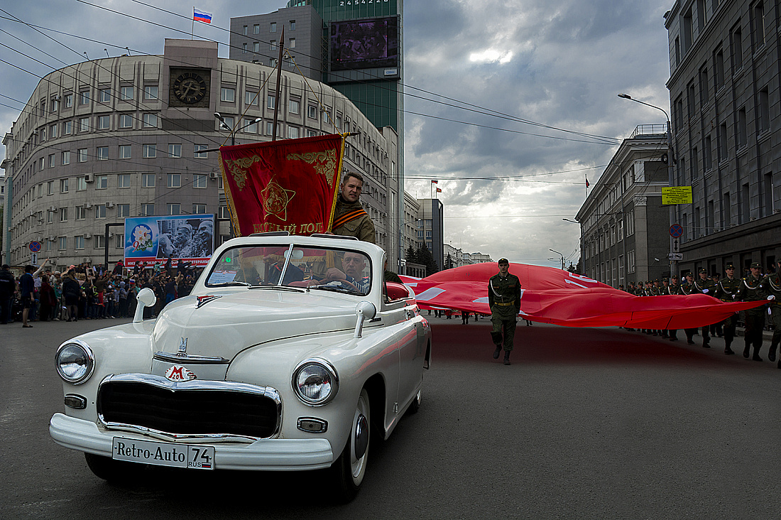 В голове колонны "Бессмертного полка" на ведущем автомобиле по проспекту Ленина провезли Знамя "Бессмертного полка"