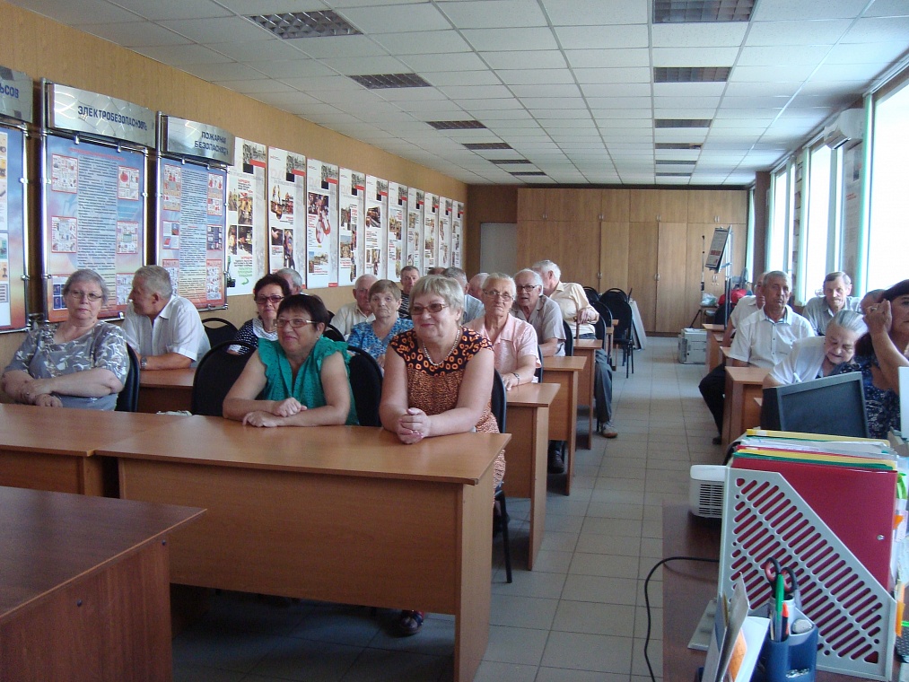 Неработающие пенсионеры в классе технической учебы на встрече с руководителями дистанции пути, которые знакомят с новыми достижениями и методами в работе. На фото почетные железнодорожники Углицкий Н.И., Мухин В.С. , которые до сих пор оказывают посильную помощь (дают советы) молодым специалистам, являясь общественными инспекторами. Настоящая встреча организована руководством в честь Дня железнодорожника.
