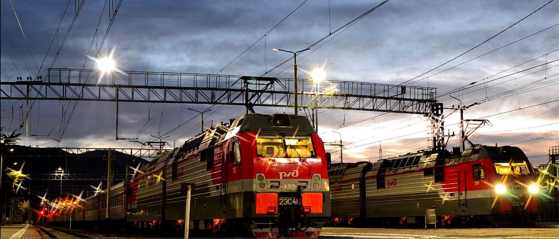 Фото выполнено перед отправлением пассажирских поездов на железнодорожном вокзале станции Туапсе.