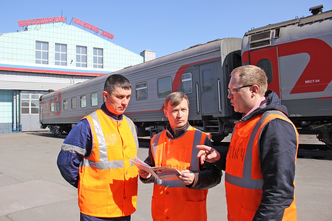 Председатель профкома пассажирского вагонного депо Новосибирск Олег Смирнов (в середине) обсуждает с работниками актуальные для трудового коллектива вопросы.