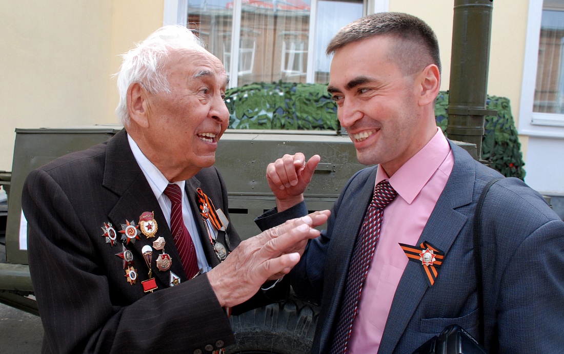 Момент общения молодого человека с ветераном ВОВ  бывшим работником Свердловской железной дороги на празднике Победы.