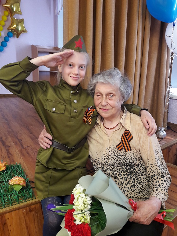 Шевчик Елена Адамовна  (труженик тыла)  с  Юноной ученицей 5 А  класса   школы № 76 г. Владивостока ,  07 мая 2019 года,  на уроке мужества.